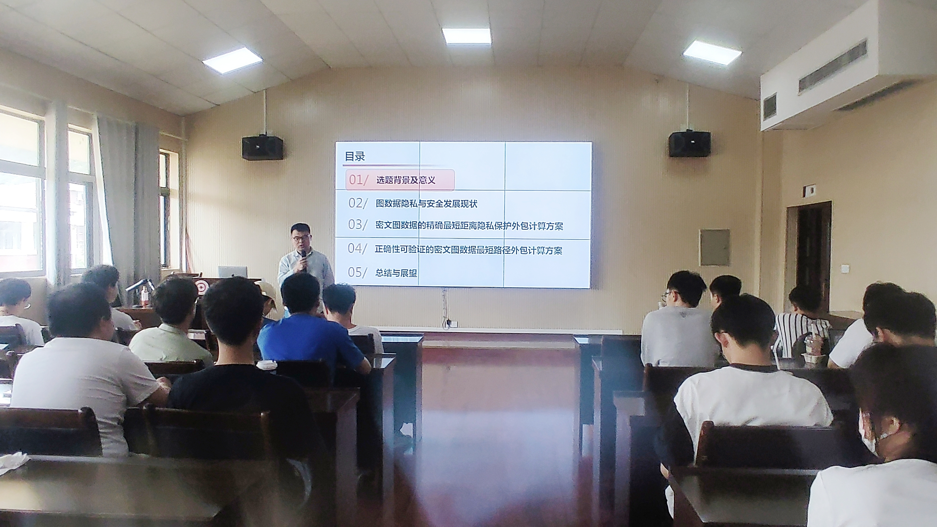 丁红发副教授的报告题目为“面向安全委托计算的图数据可验证计算方法”。丁副教授介绍了基因测序、蛋白质合成、社交网络广告营销、地理位置服务等各类信息服务需要存储大量包含敏感信息的图数据于云服务中,以便提供Computing As A Service。在CAAS中,数据安全、计算安全成为迫切需求。报告围绕图数据的CAAS,设计安全委托计算模型,并介绍能够保护数据安全和计算安全的图数据最短路径计算方案;进一步介绍能够进行可验证的图数据最短路径计算方案。
