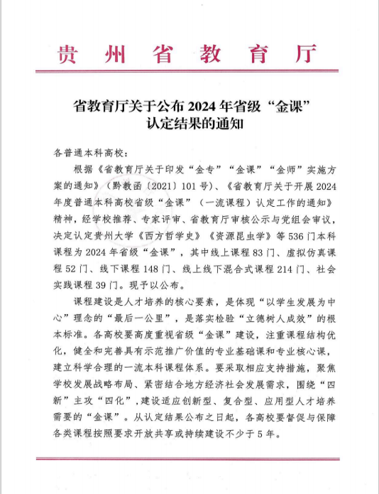 本网讯:(王游滨 图文报道)近日,贵州省教育厅公布了《2024年省级“金课”认定结果的通知》,我院4门课程获得认定。