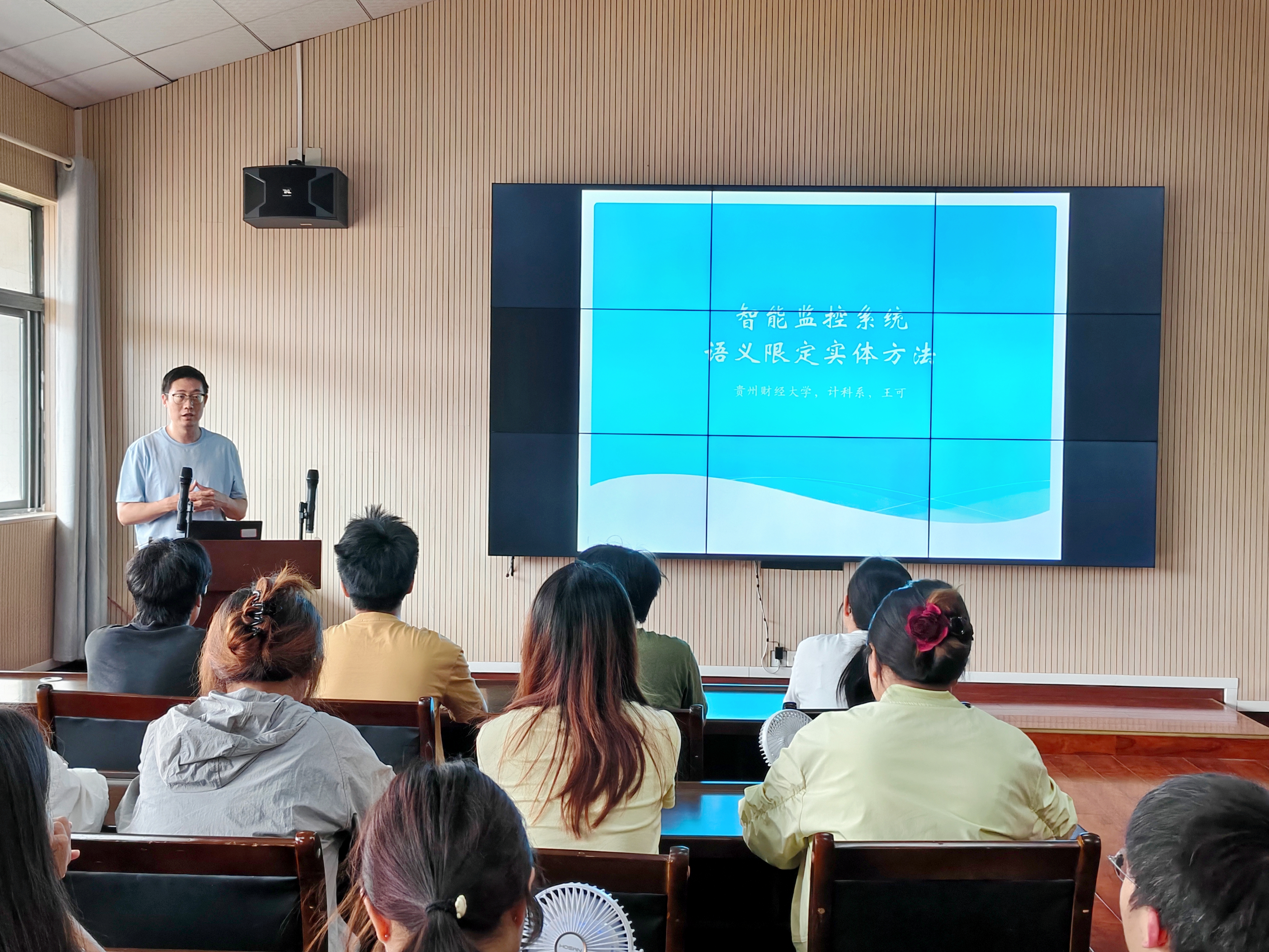 王可博士为到场师生做了题为“智能监控系统语义限定实体方法”的学术报告。智能监控系统是智能社区的重要组成部分,为了更好地理解图像,做到有效的智能预警,分析实体和场景之间的关系,十分有必要在图像语义理解中融入可解释性的实体分析。王可博士介绍了一种智能监控系统语义限定实体方案,将语义分割技术与目标识别技术相结合,旨在提升智能监控系统模型的实用性和解释性,王可博士认为,采用语义分割技术与目标识别技术相结合方案的智能监控系统有较好的全局平均精度,可以提升对现有漏报实体的预警能力。