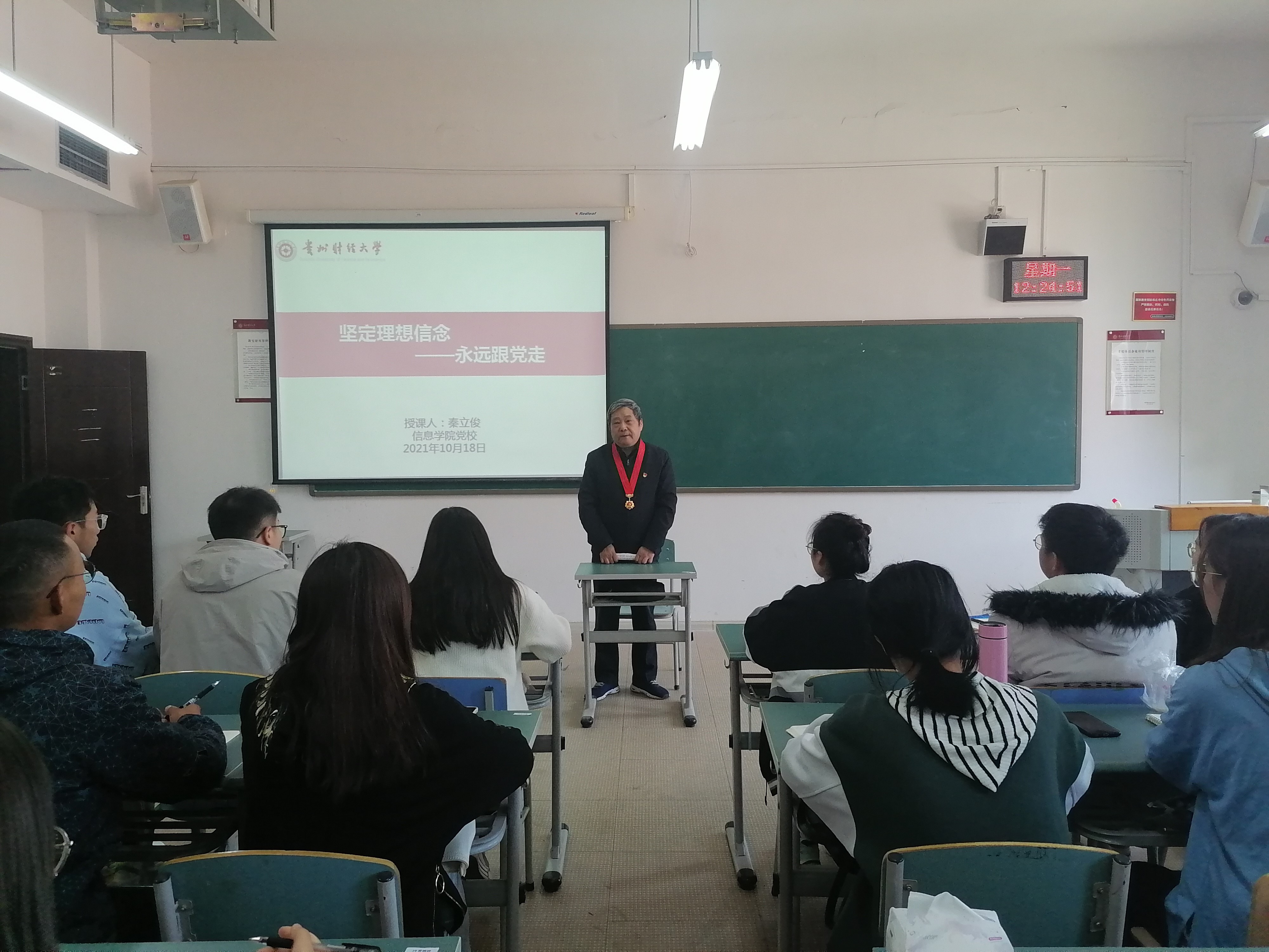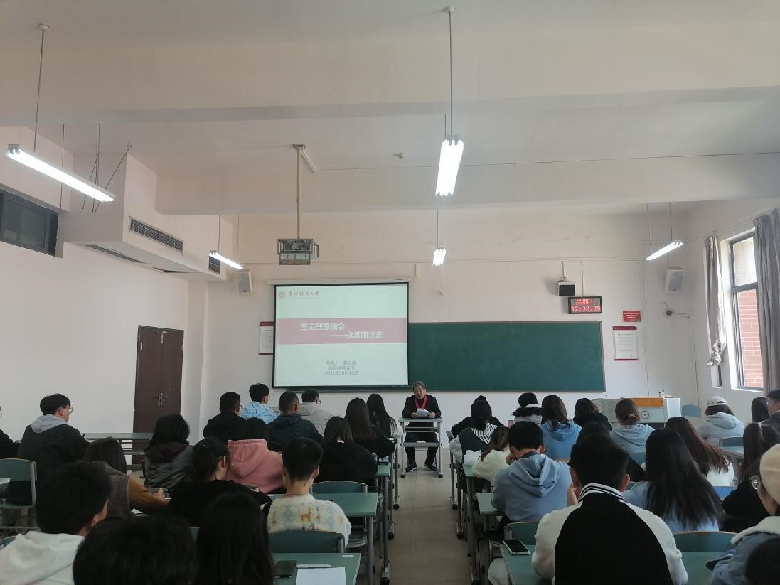 积极分子党课在志学楼414进行,党建组织员秦立俊以“坚定理想信念,永远跟党走——为什么要入党”为题做了精彩讲授。
