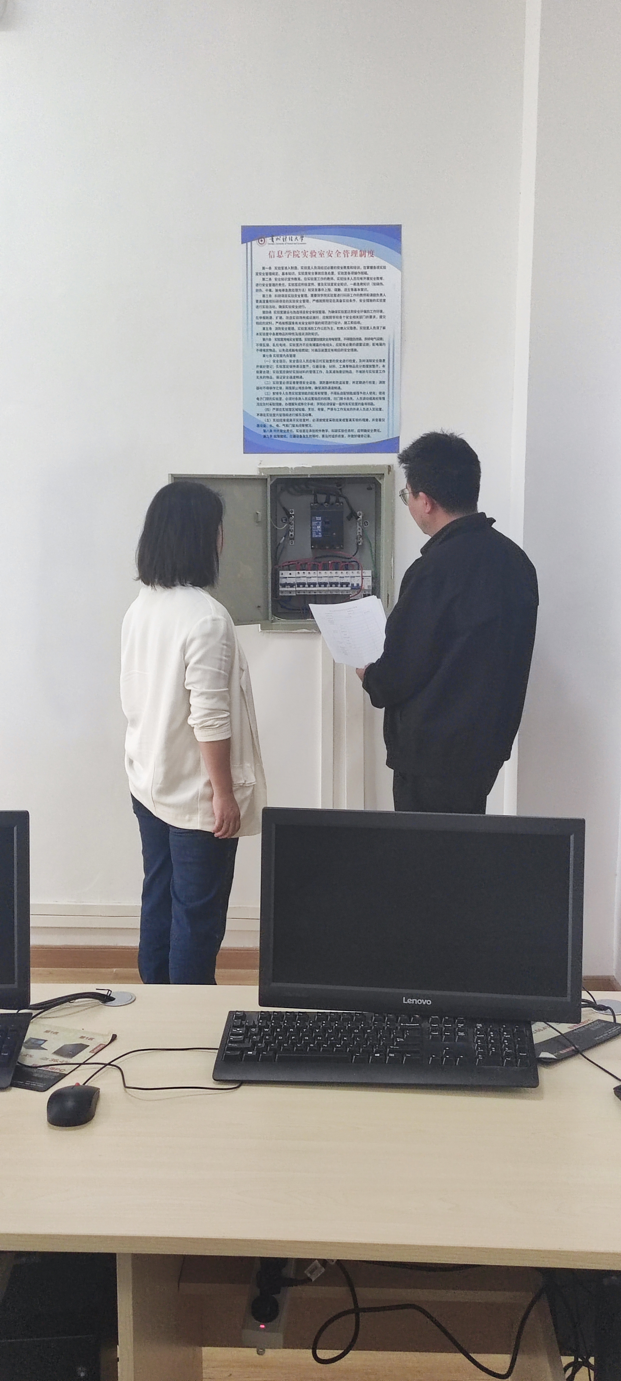 本网讯:(张骏 图文报道)3月22日下午,网络博彩 副院长梁敏及网络博彩 实验室负责人对网络博彩 网络实验室、硬件实验室、PLC实验室进行了安全常规检查,重点对各实验室的消防设施配备、水电管网布线等进行了排查,查找潜在安全隐患,现场商议后续整改措施。梁敏强调,要进一步加强规范管理,杜绝各风险点的安全隐患,确保实验教学正常运行。