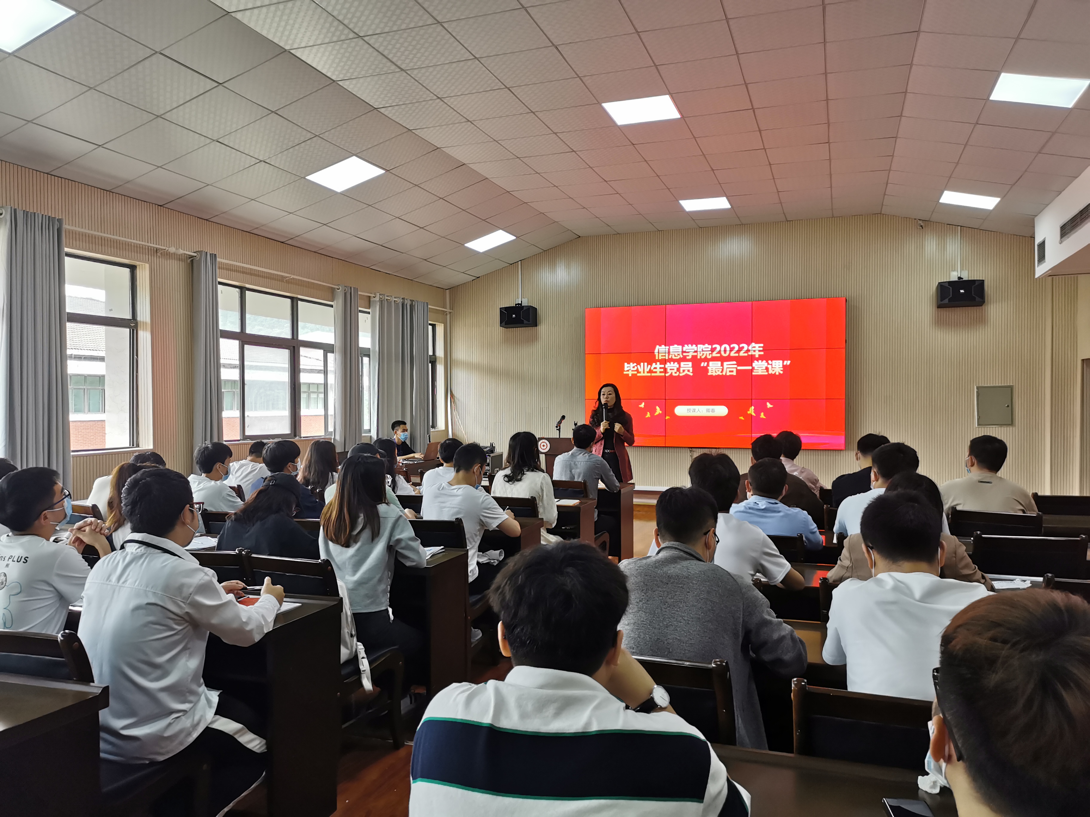 卿春以“牢记党员身份,永葆青春活力”为题给全体毕业生党员上了最后一堂党课,以中国共产党简史、习近平总书记在庆祝中国共产主义青年团成立100周年大会上的讲话为切入点,深入地剖析了在不同历史时期,青年一代的力量和贡献,引导广大党员树立远大的理想信念,将个人前途命运和国家发展联系起来,勇于创新、敢于拼搏,用奋斗的青春浇筑美好未来。她寄语毕业生党员要树立终身学习的观念,保持良好的心态,在工作中不计个人得失,不怕困难,勇于付出,时刻牢记党员身份,不忘初心、牢记使命,始终践行社会主义核心价值观,鼓励大家关心母校发展,常回母校看看。同时,卿春带领与会党员重温入党誓词。