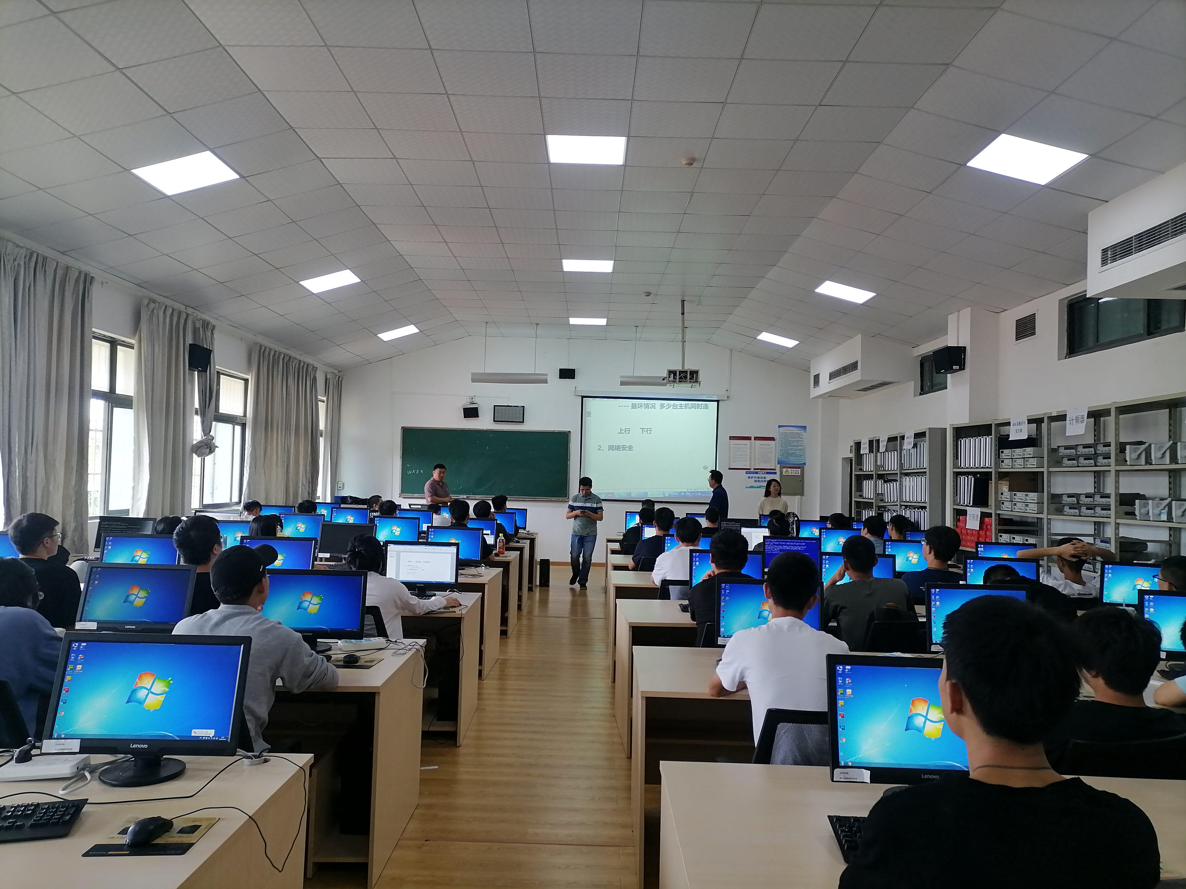 为保障我系2019专业实习的学生在暑假中的专业实习顺利 ,较好的维持教学秩序,我系实习期间,派老师全天候和学生一同学习,教学巡视密集进行。6月20日,分管实践教学的梁敏副院长及实践科张骏老师,信息工程系副主任马思根和周既松老师进行第一次网络工程专业实习巡查。